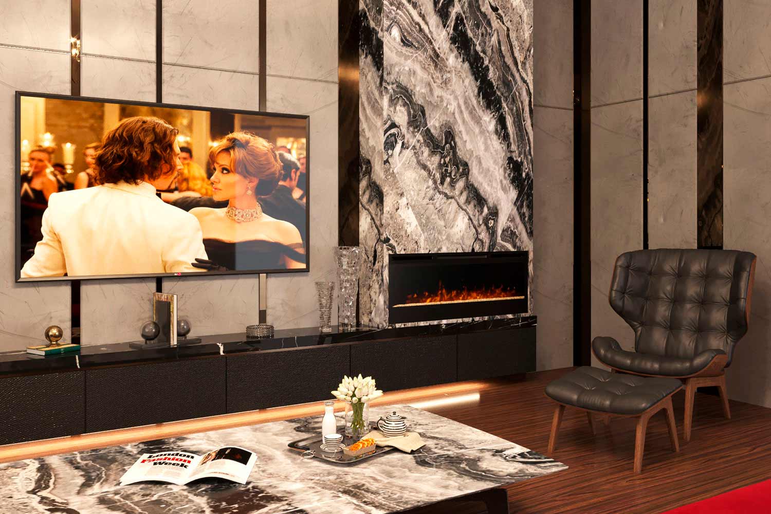 Запатентованная технология светодиодного пламени Optiflame и искрящиеся кристаллы, использованные в очаге в качестве декоративного топлива, придают камину Synergy необычный футуристический вид.