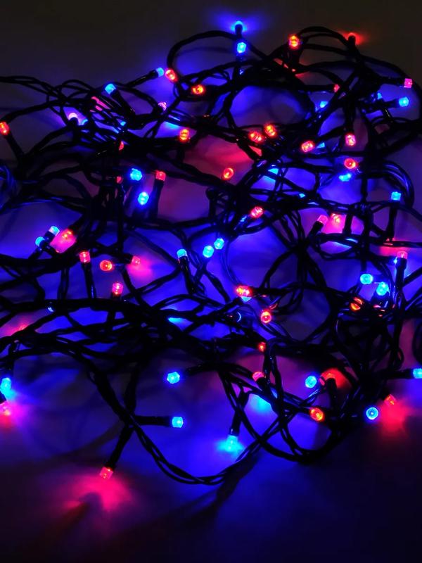 Назначение - для использования внутри и вне помещения (IP44); Длина - 12 метров; Тип ламп - светодиоды (цвет синий, красный); Расстояние между лампами - 10 см, диаметр лампы - 5 мм; Кол-во ламп - 120; Провод - черный, сетевой шнур: 150см; Материал изоляции - ПВХ; Потребляемая мощность - 7,2 Вт; Питание - от сети 220В. Дополнительно - коннектор, позволяющий подключать последовательно до 10 гирлянд.