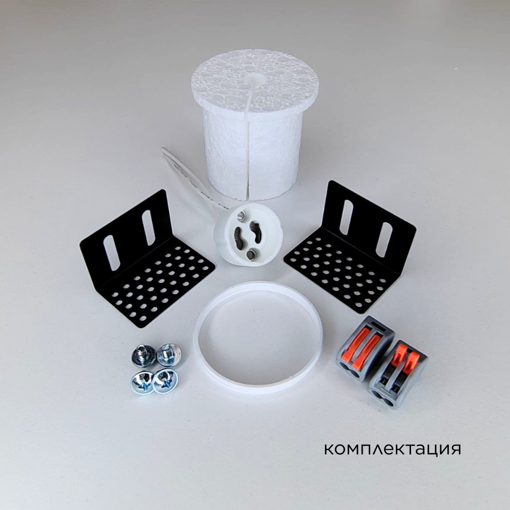 Корпус гипсовый со вставкой из 100% МЕДИ - 1 шт; Заглушка защитная - 1 шт; Кронштейн монтажный регулируемый - 2 шт; Винт установочный - 4 шт; Патрон керамический GU10 - 1 шт; Клемма соединительная - 2 шт; Кольцо стопорное - 1 шт; Перчатки монтажные - 1 шт; Руководство по эксплуатации и установке - 1 шт; Упаковка индивидуальная - 1 шт; |