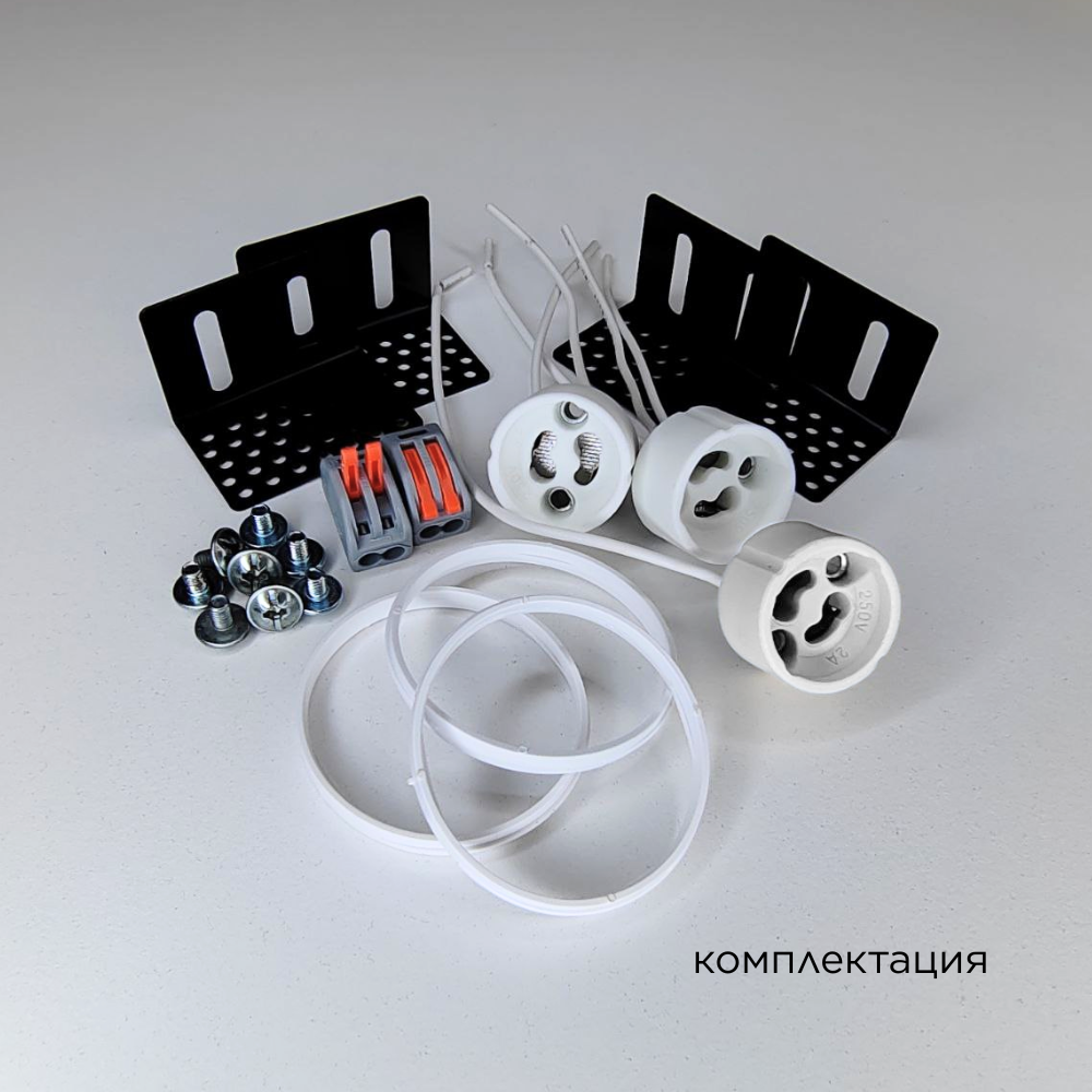 Корпус гипсовый - 1 шт; Кронштейн монтажный регулируемый - 4 шт; Винт установочный - 8 шт; Патрон керамический GU10 - 3 шт; Клемма соединительная - 2 шт; Кольцо стопорное - 3 шт; Руководство по эксплуатации и установке - 1 шт; Упаковка индивидуальная - 1 шт; |