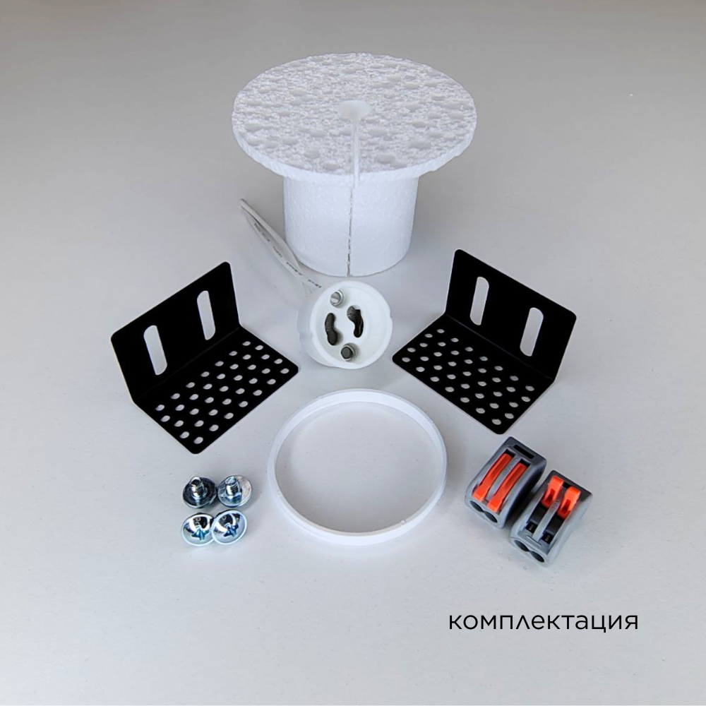 Корпус гипсовый со вставкой из 100% МЕДИ - 1 шт; Заглушка защитная - 1 шт; Кронштейн монтажный регулируемый - 2 шт; Винт установочный - 4 шт; Патрон керамический GU10 - 1 шт; Клемма соединительная - 2 шт; Кольцо стопорное - 1 шт; Перчатки монтажные - 1 шт; Руководство по эксплуатации и установке - 1 шт; Упаковка индивидуальная - 1 шт; |