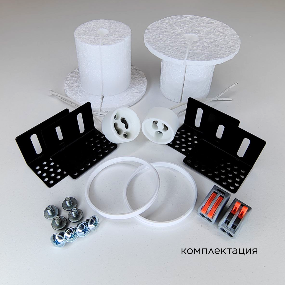 Корпус гипсовый со вставкой из 100% МЕДИ - 1 шт; Заглушка защитная - 2 шт; Кронштейн монтажный регулируемый - 4 шт; Винт установочный - 8 шт; Патрон керамический GU10 - 2 шт; Клемма соединительная - 2 шт; Кольцо стопорное - 2 шт; Перчатки монтажные - 1 шт; Руководство по эксплуатации и установке - 1 шт; Упаковка индивидуальная - 1 шт; |