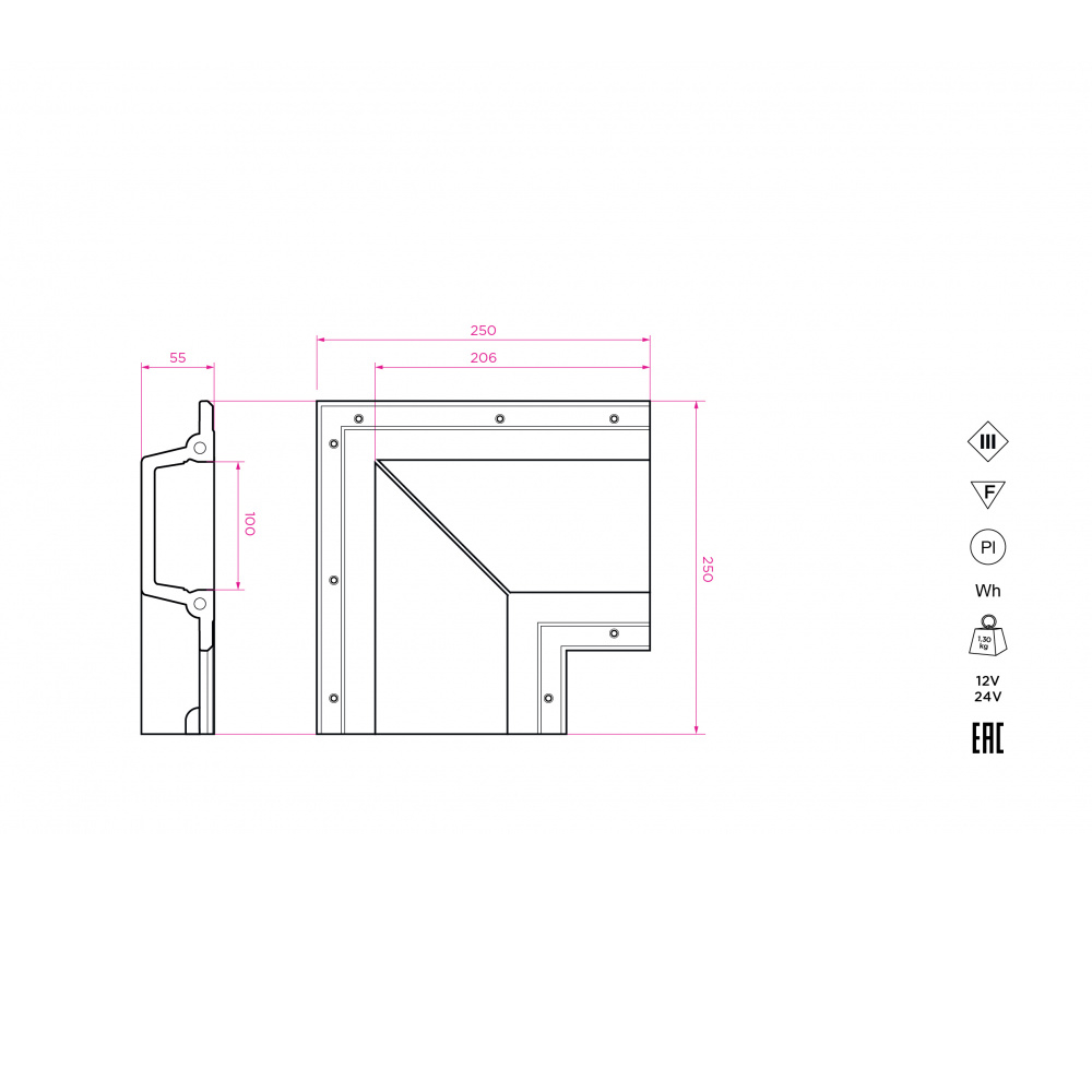 250/250/55 мм |