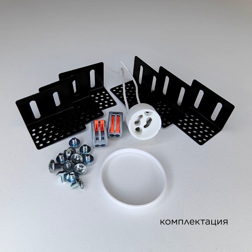 Корпус гипсовый - 1 шт; Кронштейн монтажный регулируемый - 6 шт; Винт установочный - 12 шт; Патрон керамический GU10 - 1 шт; Клемма соединительная - 2 шт; Кольцо стопорное - 1 шт; Руководство по эксплуатации и установке - 1 шт; Упаковка индивидуальная (пенопласт, картон) - 1 шт; |